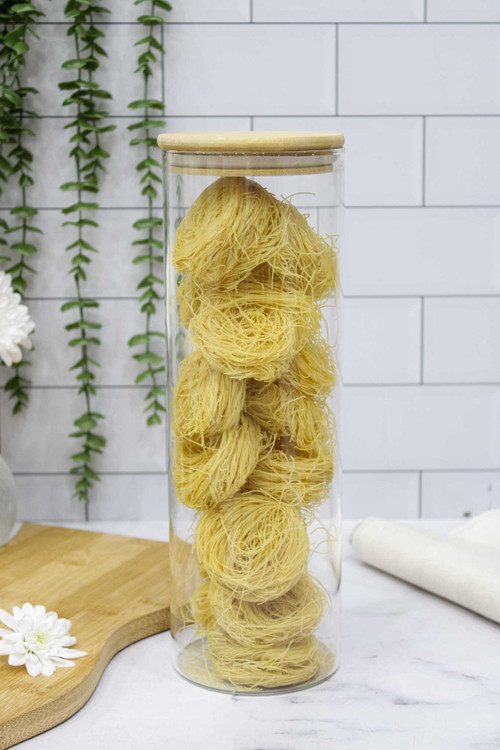 بانکه گرد شیشهای پیرکس مقاوم با درب بامبو واشردار.