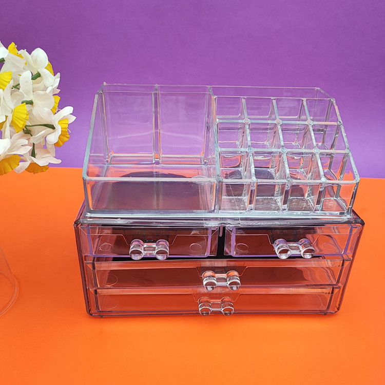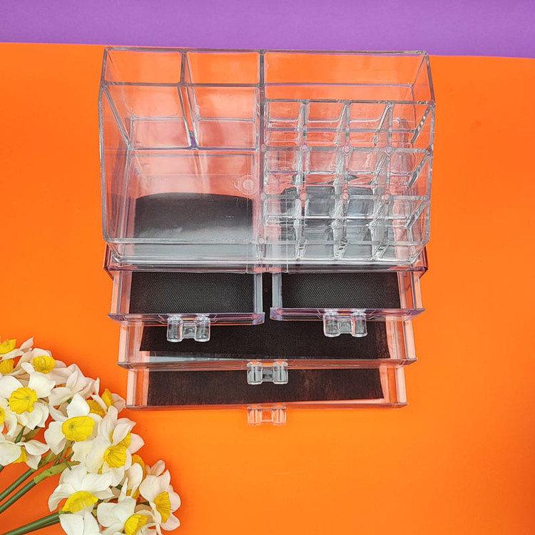 استند آرایشی چهار کشویی، بسیار شفاف و برای قرار دادن و نظم دادن لوازم آرایشی و زیورآلات ساخته شده است. این محصول از جنس اکرولیک و با کیفیت بالا و با قیمتی مناسب ساخته شده.