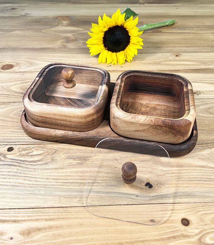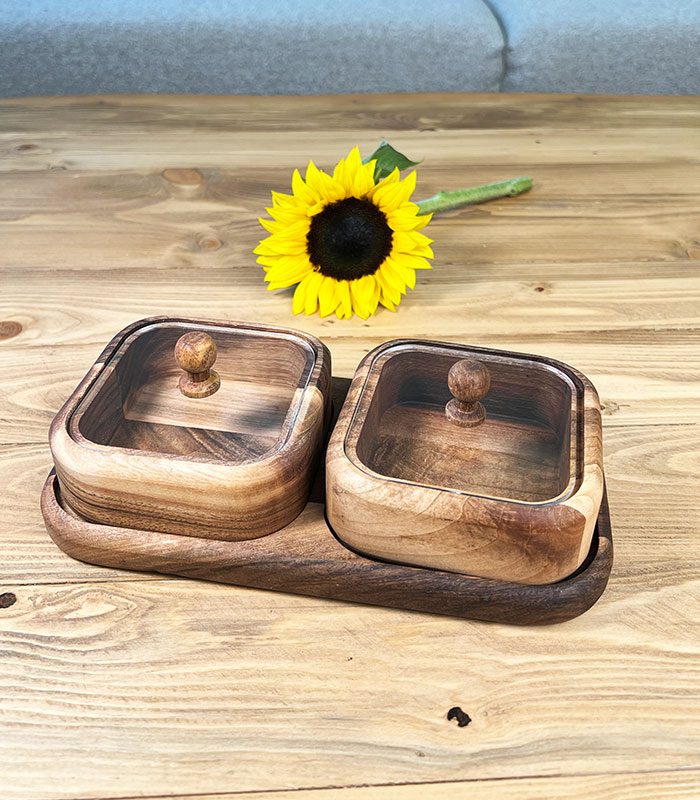اردور دو خانه چوبی برای سرو انواع آجیل ، تنقلات ، شکلات و مزه مناسب است .