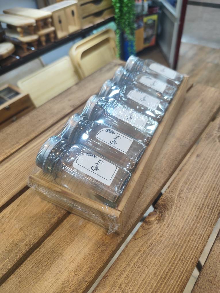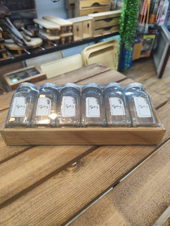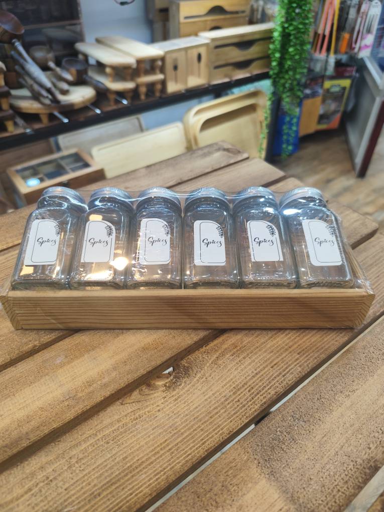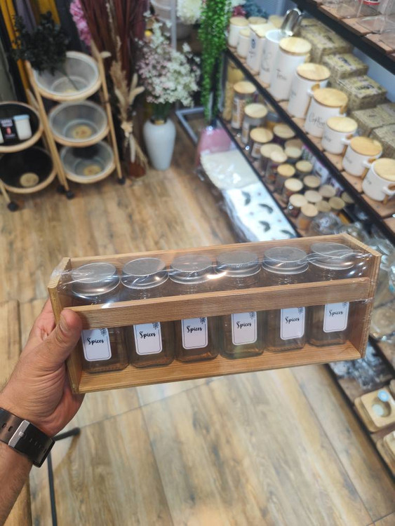 استند چوبی جا ادویهای شامل 6 عدد شیشه 12 سانت با درب فلزی میباشد که هر کدام سری نمکپاش هم دارند به همراه یک استند نگه دارنده قابل شستشو