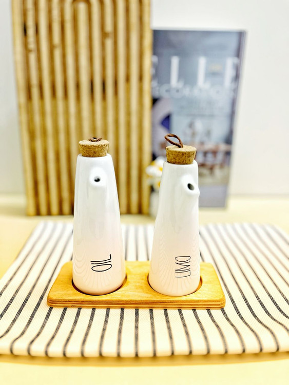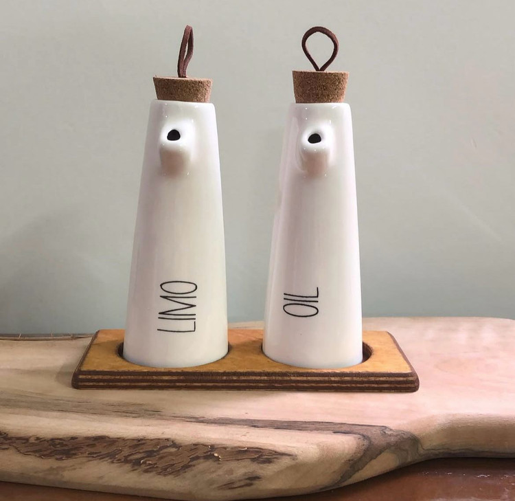 ست آبلیمو و روغن ریز تکست شامل 2 عدد آبلیمو ریز (قابل استفاده به عنوان روغن و آبغوره) و یک زیره چوبی، دارای درب چوب پنبه